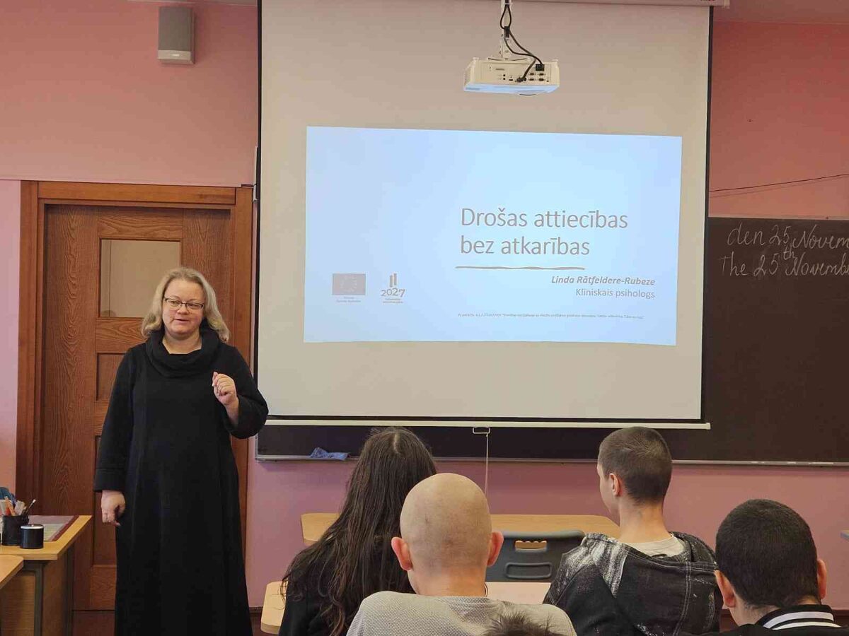 Projekta ietvaros 27.novembrī pie mūsu skolas 6.-9.kl. skolēniem ar nodarbību par atkarību izplatības samazināšanu, savstarpējo komunikāciju, sociālo tīklu ietekmi uz savstarpējām attiecībām, reproduktīvo veselību un drošām attiecībām viesojās klīniskais psihologs Linda Rātfeldere- Rubeze (sadarbībā ar biedrību “Gribu Būt”).